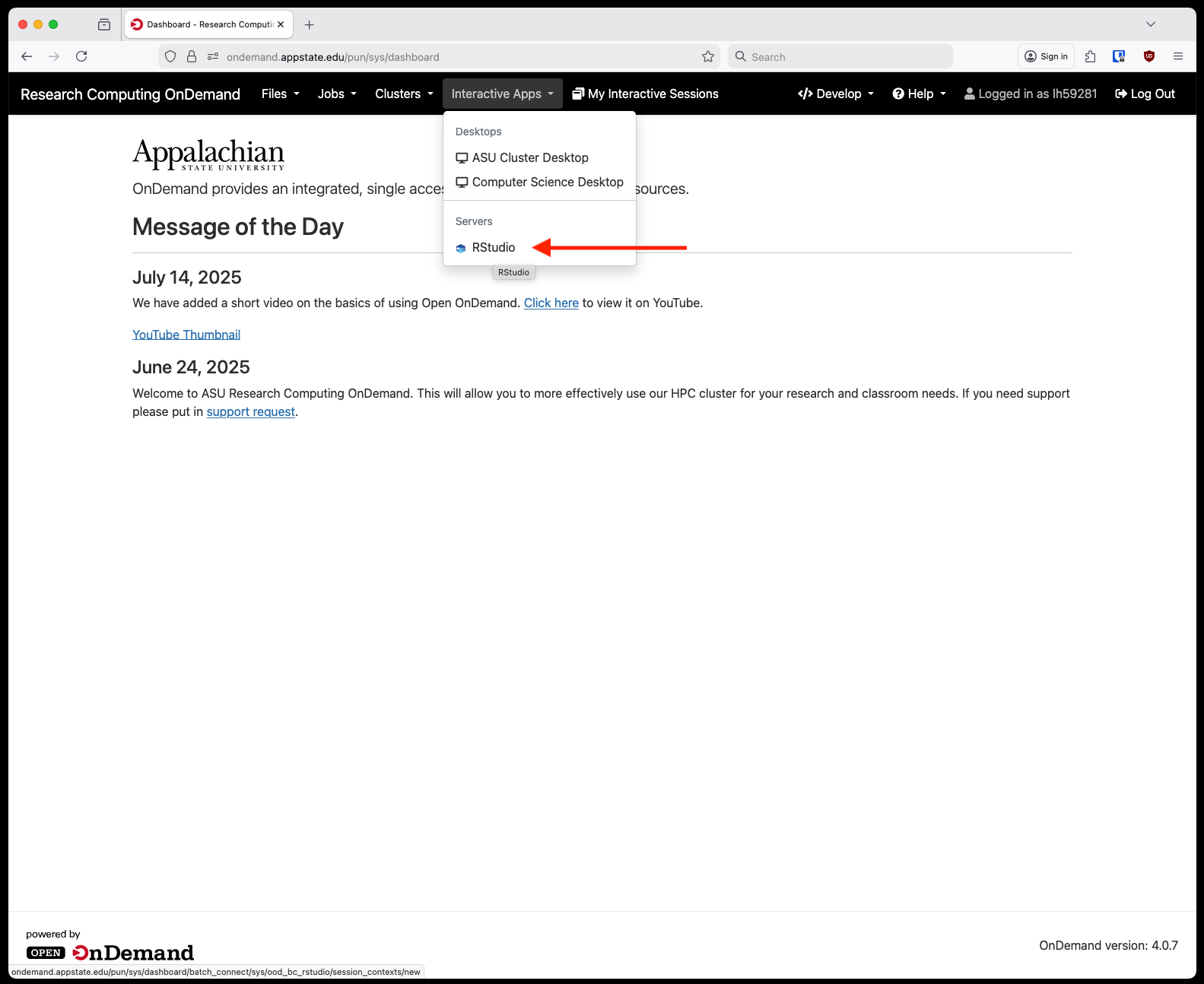 We now have RStudio available through Open OnDemand. It is accessed similarly to other interactive applications, first login to OnDemand and from the home screen select Rstudio from under Interactive Apps and Servers: